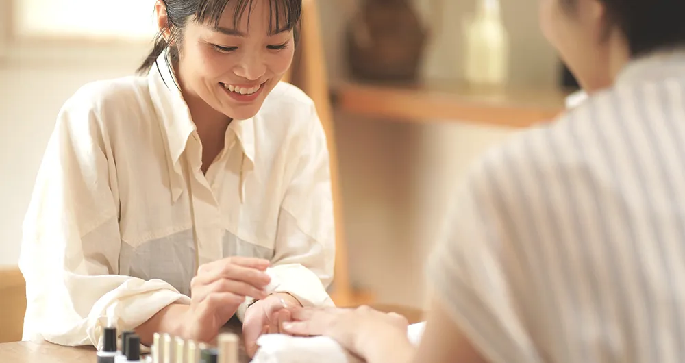 当校では、ネイルの技術だけでなく、お客様への心遣いや接客スキルも指導しています。一定の条件をクリアした生徒の方には、当校直営のネイルサロン「nail&eye Lily」への就職をサポートする特別コースをご用意。さらに、「nail&eye Lily」にて2年間勤務された方には、受講料の半額を還元する制度も。